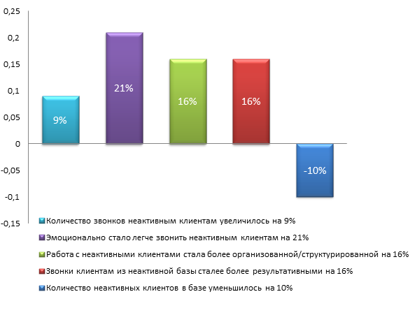 - Рост мотивации менеджеров, снижение временных и эмоциональных затрат при работе с неактивными клиентами